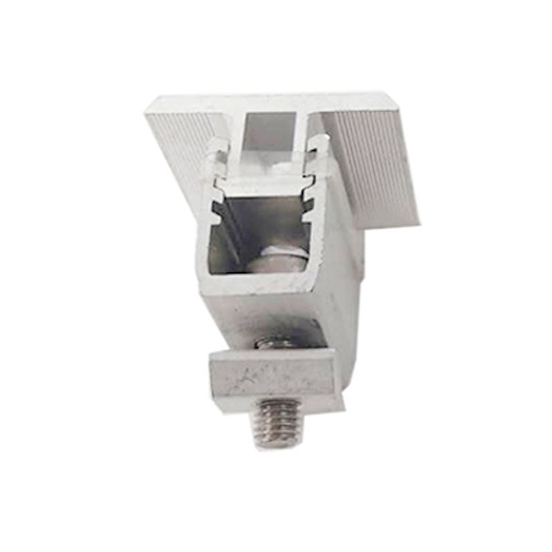 Stredná svorka a koncová svorka je príslušenstvo používané na pripojenie hliníkových koľajníc a solárnych panelov, ktoré sa zvyčajne skladá z dvoch rohových častí z hliníkovej zliatiny. Stredná svorka a koncová svorka môže poskytnúť dodatočnú podporu a stabilitu, aby sa zabezpečilo, že solárny panel zostane stabilný vertikálne alebo horizontálne.